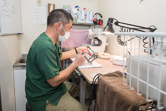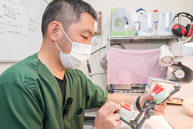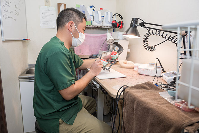 しかし、当院は患者様の入れ歯のお悩みを聞いているうちに「やはり作る人と入れる人の関係が近い方がお互いにいいだろう」と技工士さんが院内にいる仕組みを作りました。